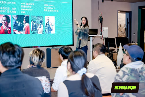 活动开启,Shure应用工程经理郑雯雯率先登台,为现场来宾深入浅出地讲解了Shure最新的音频产品和技术。从KSM系列在专业录音领域的卓越表现,到MV88 USB-C为便携式创作带来的便捷与高效,再到MVX2U二代独特的功能亮点与广泛适用场景,她都一一细致剖析,还通过生动的演示和实操,为不同需求的用户提供精准的解决方案,让来宾们对这些产品有了更直观、更深刻的理解。